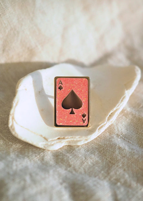 Ace of Spades. This fun little pin is a pink sparkle playing card of an ace. It's a nod to a Motorhead song, it's a low-key nod to your...