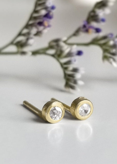 These are the most perfect, delicate and simple 14k gold stud earrings you will ever need. Dimensions. Measure 4mm across with a 2mm cubic zirconia. Details. Finished with 14k yellow gold and matching ear nuts....