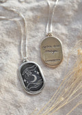 The mantra collection is a combination of thoughtful art and gentle reminders to support and guide you through your day. Each pendant is imbued with a mystical formula of invocation, each inscribed with its own unique mantra; a small message of strength and encouragement to find your path, wherever it may lead.