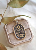 This double-sided oval pendant necklace measures 30mm in length and features original art by LanaBetty of two intertwined climbing morning glory flowers. The backside of the pendant features the words, "let love grow". Wear solo or layer with your other favorite mantra necklaces to create depth and whimsy.