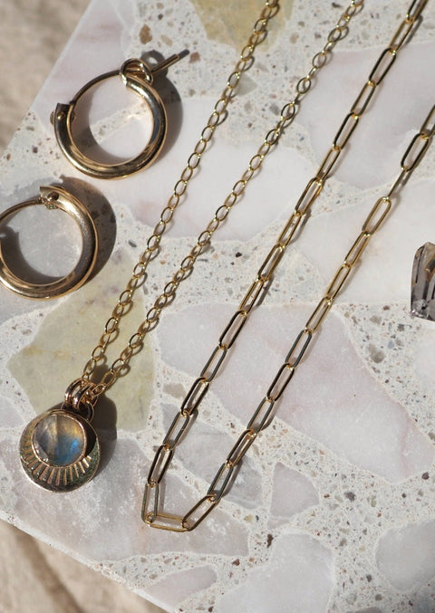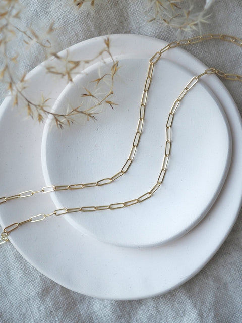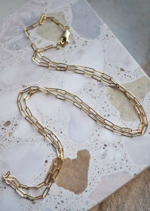 A terrific layering necklace, this paperclip chain will add texture and allure to your stack. It is elegant and classic to wear with a crew neck t-shirt, or you can layer it with shorter necklaces...