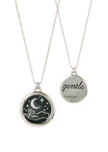 This round pendant necklace measures 20mm in diameter and features original art by LanaBetty of a hand caressing the moon. The backside of the pendant features the word, "gentle".