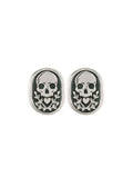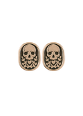 These elongated oval stud earrings feature original art by LanaBetty of a delicate skull floating above a wreath of laurel leaves. The skull is a symbol of our mortality and that it's never too late to change your path. The laurel leaves represent success and intention.