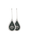 These elongated teardrop shaped arc earrings feature original art by LanaBetty of a an eye emblazoned with a goddess symbol. The eye represents clairvoyance and is a gateway to the soul. The goddess symbol is represented by two crescent moons flanking a full moon. The symbol is a representation of the changing phases of the moon which also correspond with the stages of womanhood. It symbolizes the endless cycle of birth, life, death and rebirth.