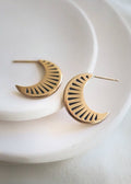 An everyday smooth hoop in bronze or sterling silver. These crescent shaped hoop stud earrings feature original art by LanaBetty of shooting lines like the view of a horizon at sunrise. .